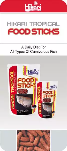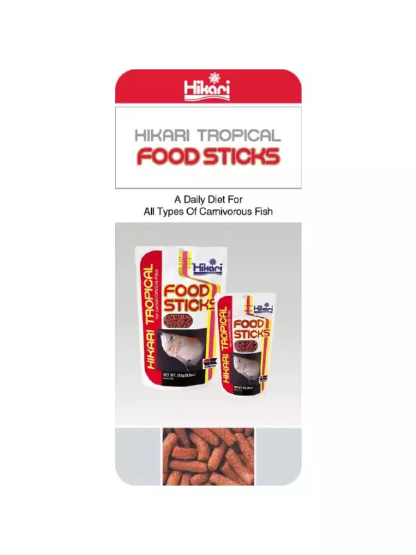 Krmivo Hikari Tropical Food Sticks představuje úplný, nutričně vyvážený přípravek, vyvinutý pro masožravé ryby, jejichž hlavní dieta z živých organismů může působit nedostatek živin. S použitím Hikari Tropical Food Sticks místo živých organismů jako krmiva snížíte riziko infekcí parazity nebo bakteriemi, které se nacházejí v každé živé potravě.