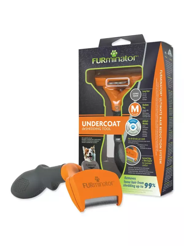 FURminator® hrablo k vyčesávání podsady pro psy středních plemen o hmotnosti do 9-23 kg s dlouhou srstí. Odstraňuje až 99 % uvolněných chlupů.