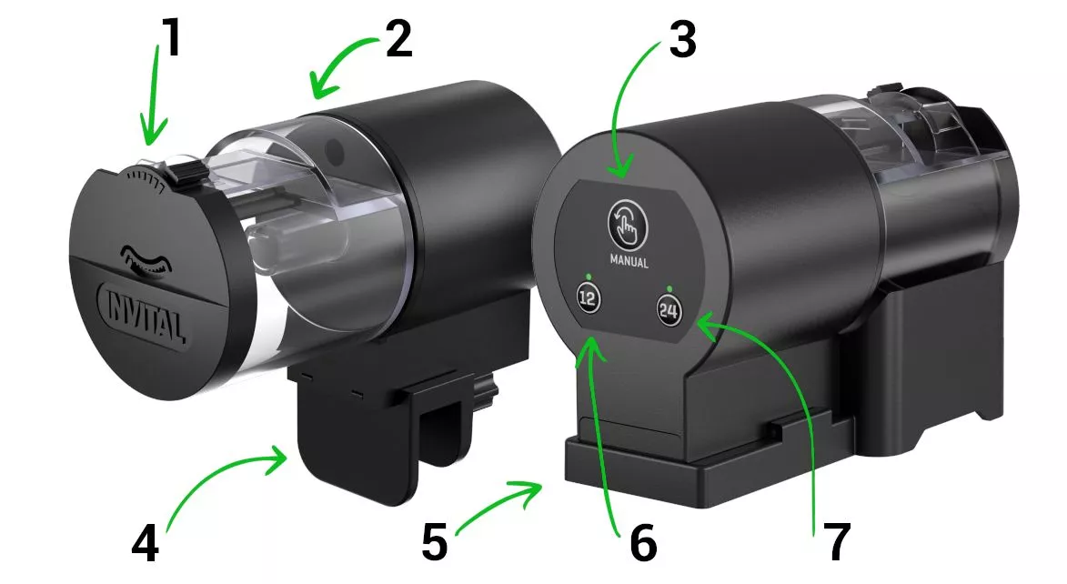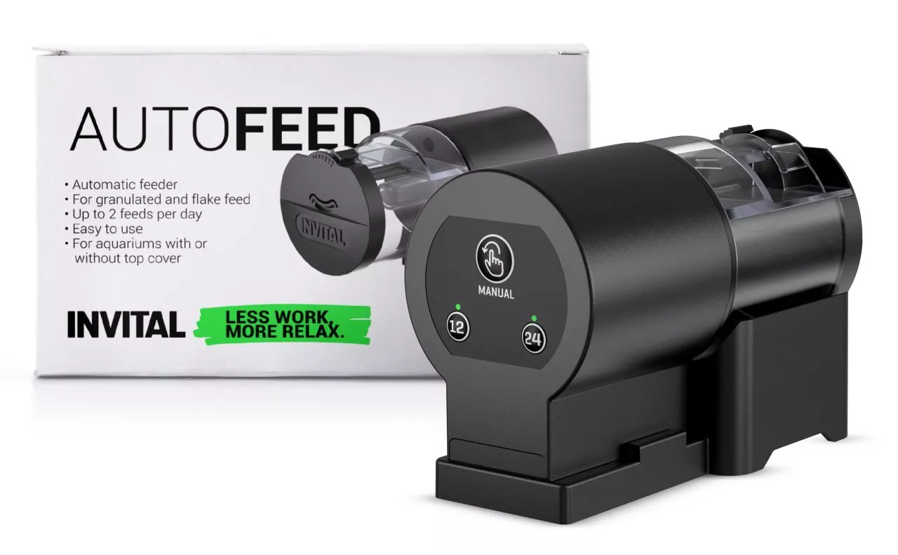 INVITAL automatické krmítko ✨ je dalším krokem k plné automatizaci Vašeho akvária. Díky automatickému krmítku můžete zapomenou na povinnost každodenního krmení - přednastavené programy samy zajistí dodávku krmiva ve dvou intervalech 12h/24h. Objemnou nádržku (100ml) s manuální regulací dávkovaného množství je možné využít pro granulované i vločkové krmivo.