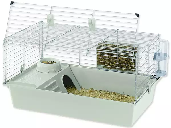 Klec má tradiční konstrukci s plastovou základnou, která tvoří úkryt a jejíž součástí je i miska na krmení. Dveře na přední straně mohou být zcela otevřené pro snadné čištění. Součástí klece jsou i jesle na seno a napaječka.