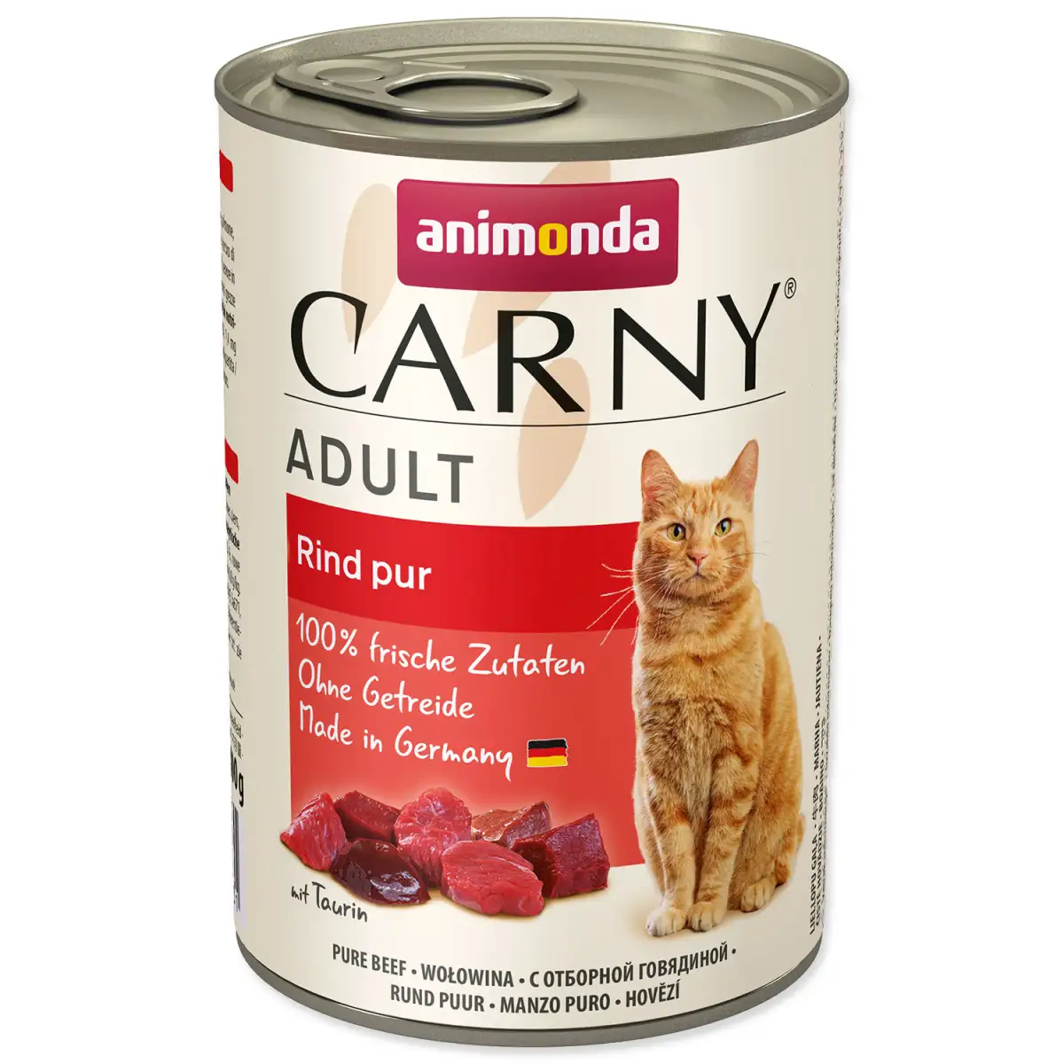 Konzerva s hovězím masem. Kompletní krmivo pro dospělé kočky.