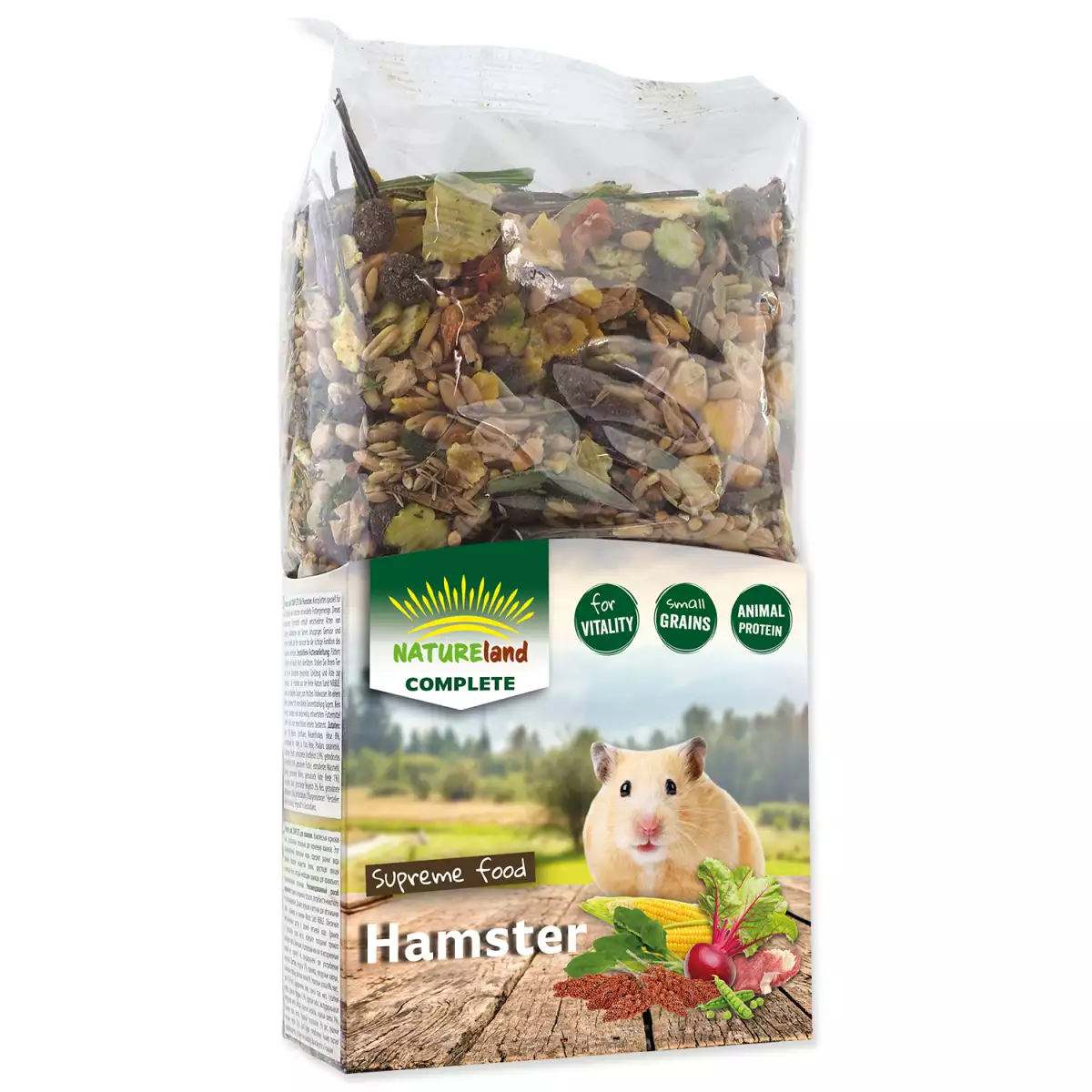 Složení: kukuřice 17 %, pšenice, kukuřičné vločky, pšeničné vločky, proso mana 8 %, hrachové vločky 8 %, oves, proso la plata, semena kanárských trav, semena travin, maso (sušené kuřecí, sušené hovězí 0,9 %, sušené ryby), extrudovaná kukuřičná mouka, zelenina (sušená mrkev, sušená červená řepa 1 %), lněné semeno, špalda, sušený jitrocel 2 %, rýže, sušení mouční červi 0,5 %.