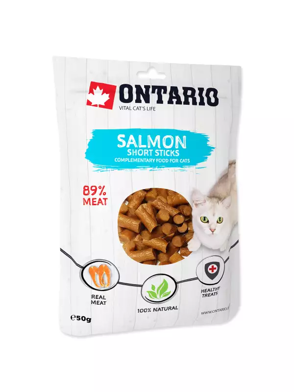 Doplňkové krmivo pro kočky. Krátké masové tyčinky z lososa s vysokou chutností, ideální jako odměna.