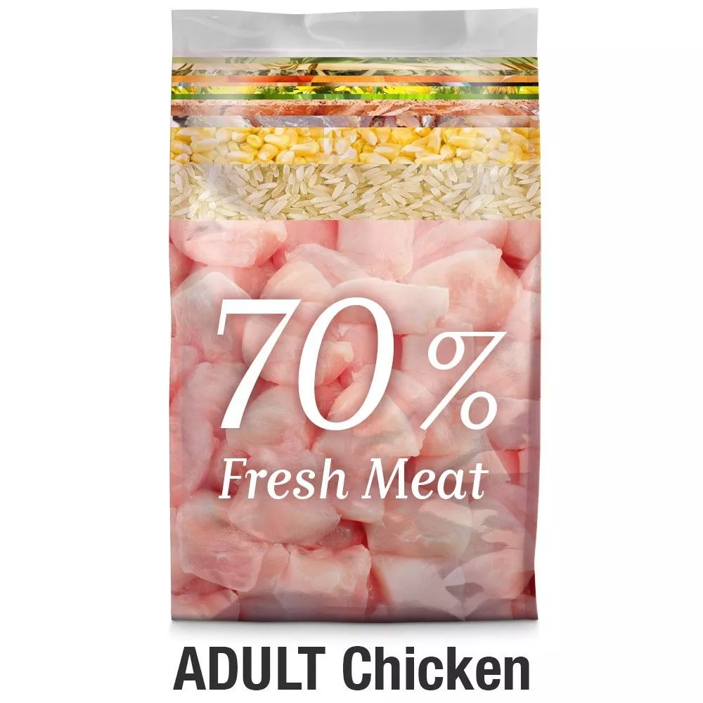 Čerstvé kuřecí maso (70 %), rýže, kuřecí tuk, kukuřice (geneticky neupravená), moučka z drůbežího masa,sušené drůbeží maso, sušená jablečná dužina, lososový olej, za studena lisovaný olivový olej, za studena lisovaný lněný olej, extrakt ze slávky zelenoústé (zdroj glukosamin hydrochloridu), semena ostropeřce mariánského, semena fenyklu, kořen smilaxu lékařského, celer, artyčoky, řeřicha, extrakt z heřmánku, smetanka lékařská, prášek z hořce, juka, chlorid draselný.