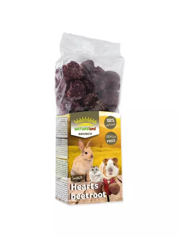 Bezobilné doplňkové krmivo pro králíky a hlodavce. Drobné pamlsky ve tvaru srdíček jsou velice chutným snackem pro vašeho mazlíčka. Červená barva produktu je získána pouze díky přidané červené řepě, která zároveň podporuje chutnost výrobku. Vzhledem ke svému složení je tento přírodní pamlsek velice vhodný pro králíky, morčata i činčily, ale bude chutnat také dalším druhům drobných hlodavců.
