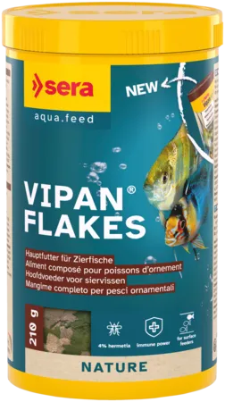 sera Vipan Nature je základní krmivo z plovoucích vloček bez barviv a konzervačních látek pro všechny u hladiny se krmící okrasné ryby.